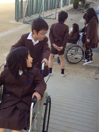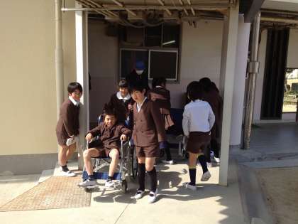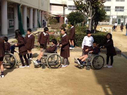 2月26日(水)に4年生は、総合的な学習で車いす体験をしました。大阪市立心身障害リハビリテーションセンターの方に来ていただいて、実際に乗る「自走体験」と車いすに乗る人を介助する「介助体験」の2つを学習しました。実際に校内を乗りまわって、10cmの段差がかなり大きいことや、一般的なマンションの廊下の幅が80cmなのは、車いすの幅と関係あることなど、体験を通していろいろなことを学びました。
