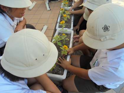 はぐくみネットの方々と蒔いたヒマワリを植え替えました。ポットからプランターに植え替えました。かわいい花をつけています。花があるとホッとします。酉島憩いの家にもらっていただきます。