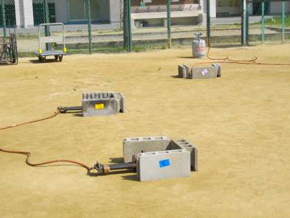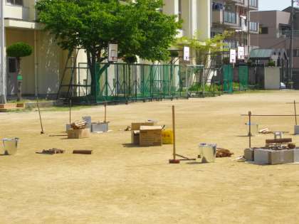 運動場には、ご飯を炊く飯盒用のかまどと、カレーを煮るかまどが4つの班分用意されています。