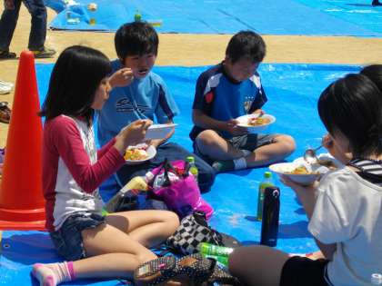 やっとカレーができました。飯盒の御飯はおこげもあって、おいしそうにつまんでいました。班ごとに集まってみんなの力で作ったカレーを食べました。自分の班のカレーが一番おいしいと言い合っていました。