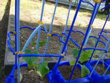 2年生は生活科の学習で、野菜の苗を一人ひと鉢の植木鉢に植えました。キュウリやトマト、ナスビなど自分が選んで植えた野菜を育てます。倒れないように支柱もつけました。おいしい野菜ができますように、毎日お水やりをがんばっています。