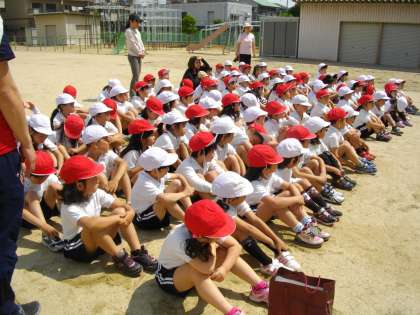 5月22日(木)に1.2年生は、生活科の学習で、サツマイモの苗を植えました。この苗植えは、地域の方にご指導やお世話をしていただいていますが、長く続いている活動です。まず、地域の方に苗の植え方を教えていただきました。1年生もしっかりお話を聞いていました。