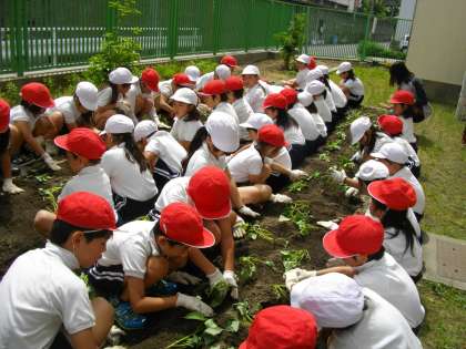 学習園に行って、いよいよ苗を植えます。地域の方が畑に腐葉土や肥料をまいて土を作り、畝もきれいに作って、子ども達が植えやすいように準備してくださいました。「ねかせて、土をかけて・・・」教えていただいた通りに植えました。これからがお世話です。秋にはおいしいお芋がたくさんできるように、お水やりをがんばります。