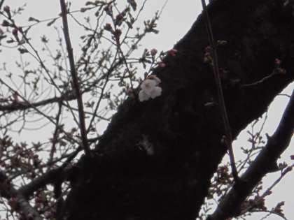3月20日。校庭の桜が開花しました。敷地の南西の角にあるソメイヨシノです。淡いピンクの花が咲きました。