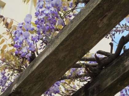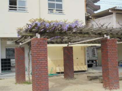 校庭に藤棚があります。昨年度かなり剪定をしたので、花が咲かないかもしれないなと思っていましたが、きれいな花が咲き始めました。蜜を求めて蜂も飛んできました。生き物って凄いですね。