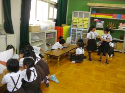 多目的室に、2年生が育てた生き物ごとにコーナーを作り、1年生を迎えました。