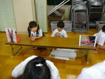 7月14日(月)の3時間目に生き物ランドをしました。これは2年の生活科で生き物を育てる学習がありますが、その生き物についてや育て方を、1年生に教えてあげようというイベントです。1学期は、学校探検に続く1.2年合同の生活科の学習です。