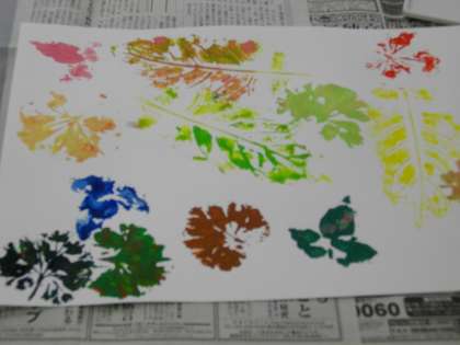 初めは学校ではしたことがないので戸惑っていましたが、要領を得たら、子どもの発想はすばらしいです。写真のように1色だけでなく、1枚の葉にも色を塗り分けたり、葉の置き方にもこだわったりするようになってきました。