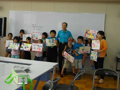 最後にできた作品をもって記念撮影です。子ども達は作品を新聞紙に挟んでもらって、大事そうに持って帰りました。