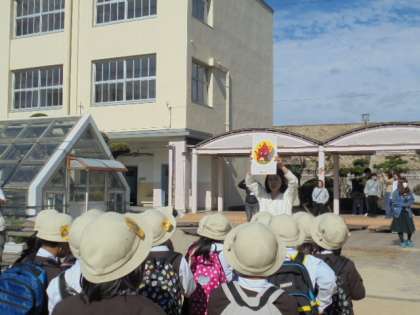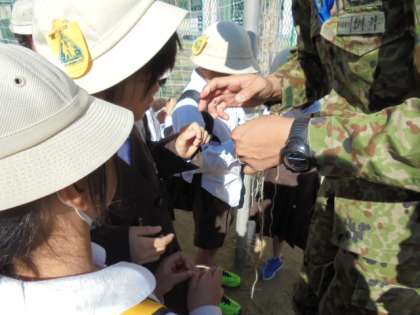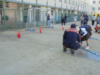 中学年は水消火器で、消火訓練をしました。初期消火の大切さ、火の根元を狙って消火することを学びました。
