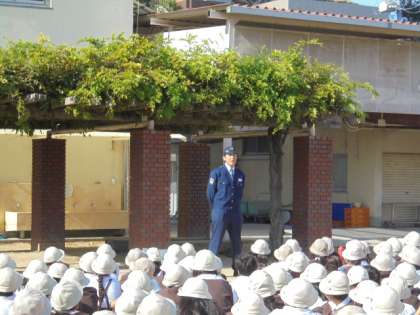 11月7日2時間目、不審者対応訓練をしました。不審者が南門から侵入してきたらどうすればよいのでしょうか。教室の鍵をして、身の安全を確保します。不審者を警察官が取り押さえたところで、みんなで運動場に避難しました。