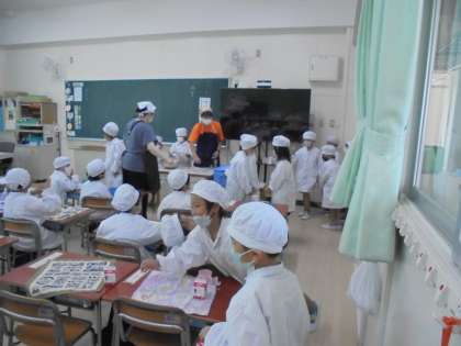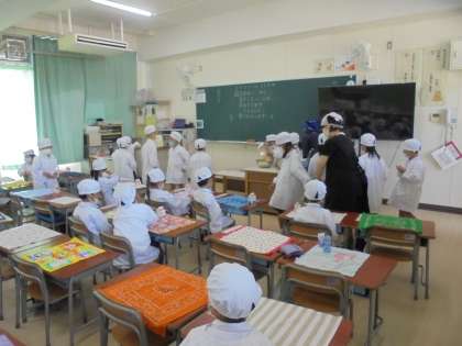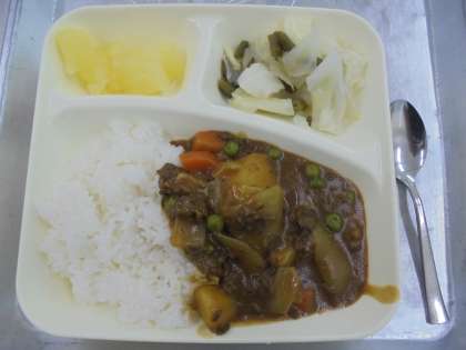 今日はカレーライスでした。給食当番にもすっかり慣れ、準備をてきぱきすることができていました。