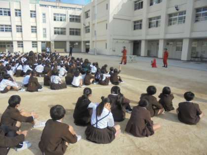 今回は理科室から火が出たという想定で行いました。全員真剣に訓練を行うことができました。此花消防署からも隊員の方に来ていただき避難するときの注意や消火器の使用などを教えていただきました。