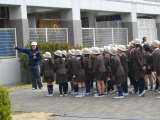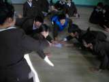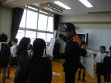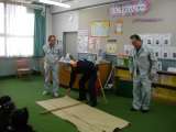 高学年は学年ごとに集まって、消防署の方と地域の防災班の方を講師として、「三角巾...