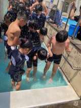 水難事故を想定して着衣泳を体験しました。水着だけの時より、重たくて思うように泳げ...