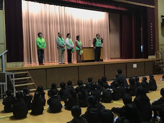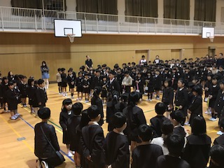 対面式です!1年生から6年生まで勢ぞろいしました。みんな仲良く学校生活を送りましょう!見守り隊の皆さんもありがとうございました。