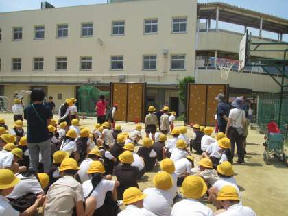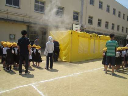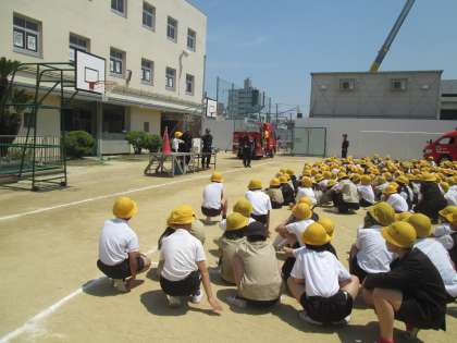 その後、此花消防署の方々の協力を得て、通報訓練や煙体験・消火体験などをしました。
