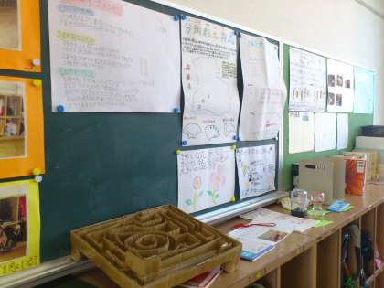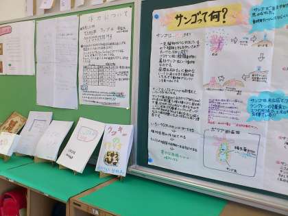 5年生の背面掲示に、夏休み自由研究を展示しています。