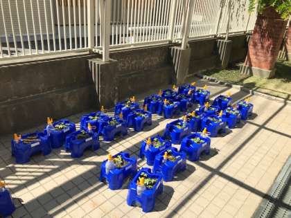 一年生がこまめに水やりをしています!ついにふたばが・・・。うれしいですね!もっと大きくなあれ!