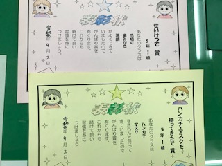 日差しが戻り、蒸し暑い児童朝会でした。校長先生の話の後、各クラスが表彰を受けました。まだまだ残暑が厳しいようです。汗の始末ができるように、ハンカチやタオルをきちんと持ってきましょう。また、歯みがきや洗顔、爪切りを忘れないようにしましょう!