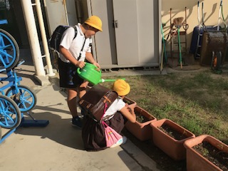 下校前に当番活動です。忘れずにお世話すること、とても素敵なことですね。そんな優しい気持ちがうれしいです!