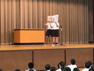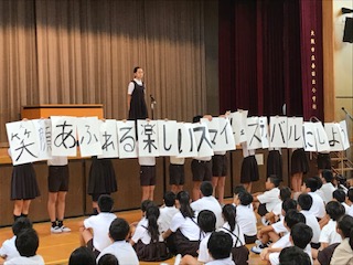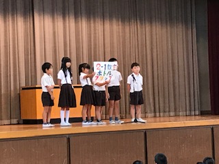 今日の児童集会では、今週土曜授業で行われるスマイルフェスティバルでの各学級から出されるゲームの紹介がありました。いろいろな工夫があって楽しみです!。最後に、児童会からめあての紹介があり、今からドキドキワクワクします!お家の方も是非来てください!
