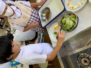 ドレッシング作りでは、しっかり混ぜたり、ゆで卵をむく時は「ヒヨコが出るかも」とワクワクしながら丁寧に剥いてました。