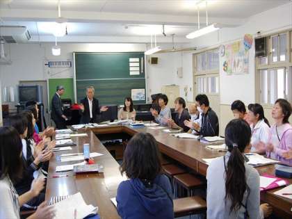 授業研究会の後、音楽室において研究討議会を行いました。授業で良かった所、課題のある所、質問など活発な討議を行いました。講師先生からは、具体的な指導方についてご教授いただきました。