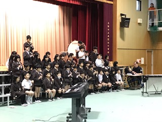 三年生はリコーダー演奏です。心地よい音色が講堂いっぱいに広がります。