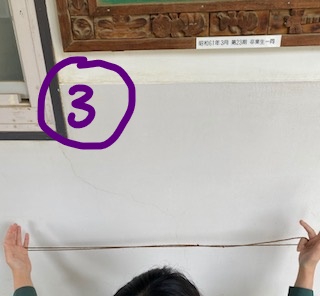 しゃしん1と2・・・両手(りょうて)の小指(こゆび)にひもをかけ、右手の小指を後ろ側に2回ひねります。