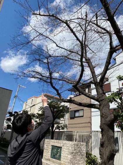 みんなが帰(かえ)った、午後(ごご)、「10年後(ねんご)に会(あ)いましょう」の碑(ひ)の桜(さくら)の木(き)の開花(かいか)を判定(はんてい)しに行(い)きました。
