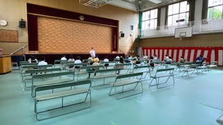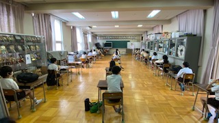 登校後、講堂で担任の先生から、全体での話があった後、多目的室で「楽しかったこと」を原稿用紙に書きました。