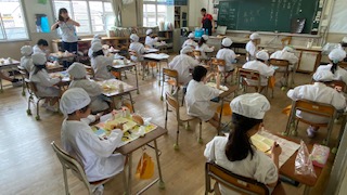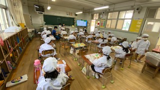 6月1日から、児童の皆さんが待ちに待っていた「給食の時間」もスタートしています。給食調理員さんが丹精込めて作ってくれた給食を、当番さんが手運び。