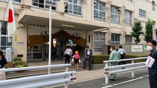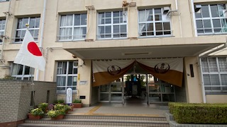 朝の登校時に、保護者と1年生が一緒に登校し、講堂に移動。区役所からは、高橋区長をはじめ、副区長、教育担当課長含め5名の方が、正門で出迎えていただきました。