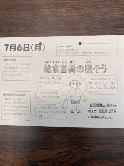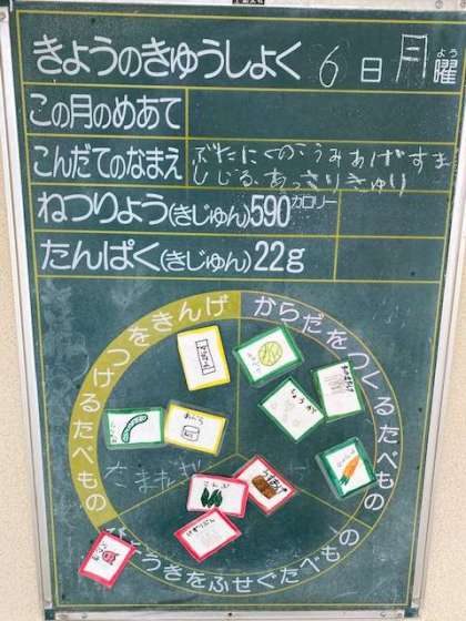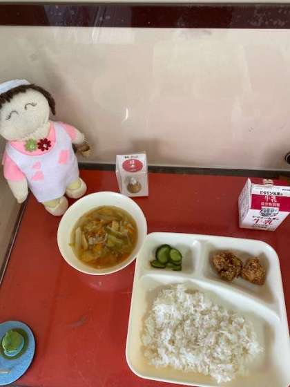 本日の給食は、豚肉の香味揚げ、すまし汁、あっさりきゅうりです。豚肉には、ビタミンB1がたいへん多く含まれており、疲労回復効果が期待されています。また、良質なタンパク質は、美肌効果にも役立つとされています。しっかり噛んで、胃への消化も助けましょう。