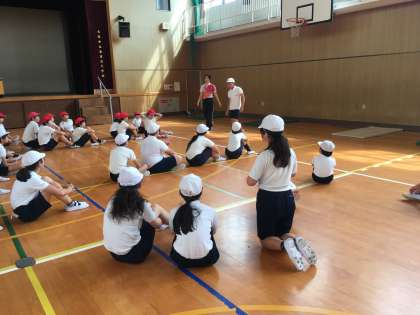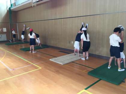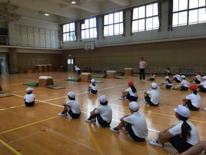 運動場で体育ができないので、講堂で体育をすることが続いています。