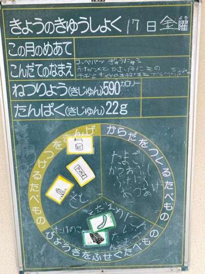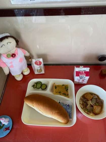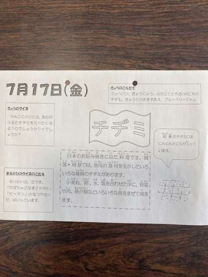 本日の給食は、豚肉と野菜の煮物、チヂミ、きゅうりの甘酢和え、ブルーベリージャムです。