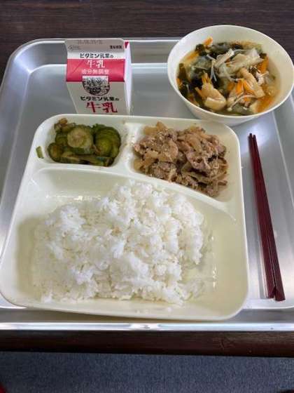 本日の給食は、豚肉のゴマだれ焼き、五目汁、きゅうりのおかか和えです。