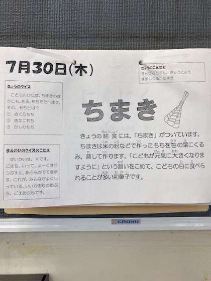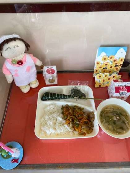 本日の給食は、きんぴらちらし、すまし汁、ちまきです。