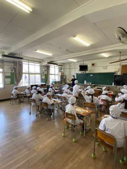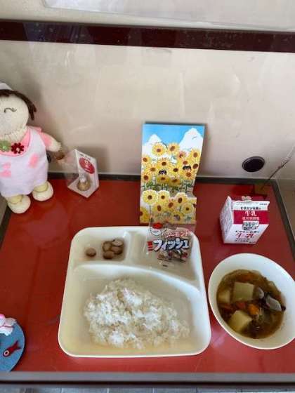 本日の給食は、肉じゃが、とら豆の煮物、アーモンドフィッシュです。