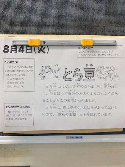 とら豆は、ビタミンB2と食物センイが豊富で、炭水化物と合わせて、発育のビタミンと言われています。体が大きくなるお年頃。しっかり噛んでたくさん食べましょう!