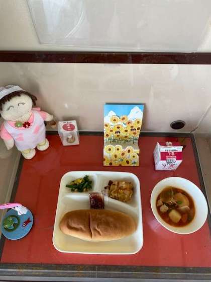 本日の給食は、ケチャップ煮、三度豆とコーンのソテー、りんごのクラフティです。