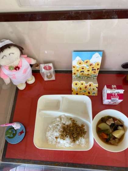 今日の給食は、鶏肉とじゃがいもの煮物、紅鮭そぼろです。