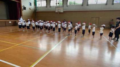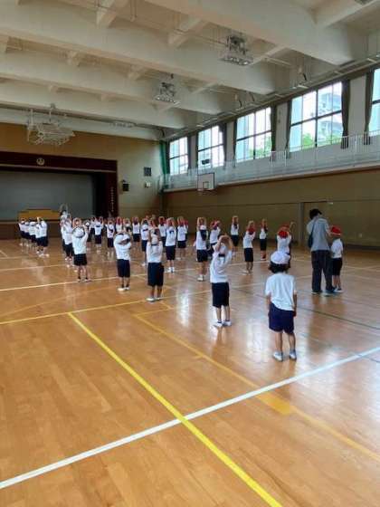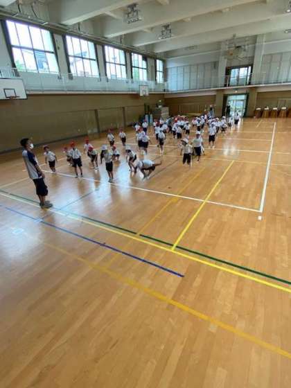 1年生が、講堂で体育の授業を行いました。今日は、準備体操、メインの「跳躍」の活動。前後左右に大きくジャンプ、回転ジャンプなど、号令に合わせて動きます。楽しく、爽やかな汗をかいて終了。さー、次の授業だー。