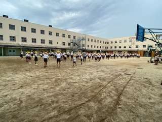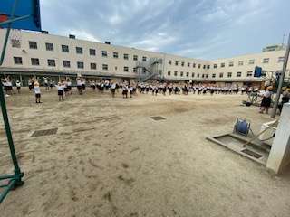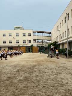 曇り空のもと、児童会が主催する集会を行いました。「私が言ったことと反対のことをやってください。左手をあげてください。」と、言われて、皆さんは右手をあげます。「立ってください。」と、言われて、皆さんは座ります。ちょっと混乱している人もいましたが、楽しんでいたようです。