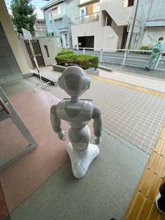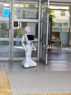 最後の登校お出迎えとなりましたが、児童の皆さんに声かけしました。ペッパーさんもお別れがさみしく、後ろ姿が物語っていました。(T . T)