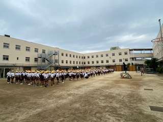 早朝は小雨も降っていましたが、曇り空のもと、全校朝会を実施しました。