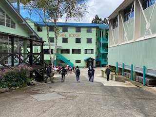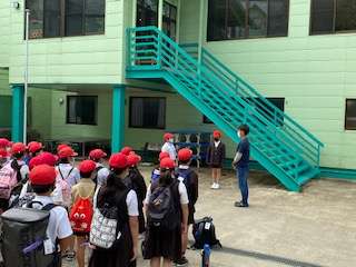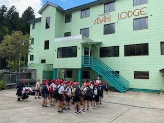 アサヒロッジに無事、到着しました。天候は、曇り空で、気温は20度。過ごしやすい天候です。児童の皆さん、全員元気です。自然いっぱいでーす。