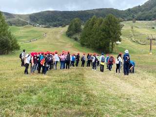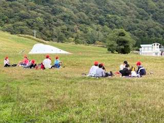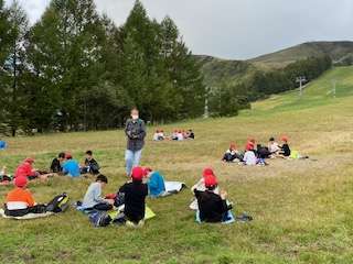 ハチ高原は、スキー場。昼食は、ゲレンデで食べます。天候は曇り。「さあー、食べよう!」の合図で、歓声があがります。やっぱり食べることは、楽しみの1つ。