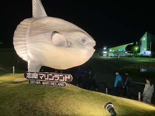 夕食ごは、マリンランドへ。夜の水族館をまわります。マンボウの生態についての展示や、多くの生き物が展示されています。
